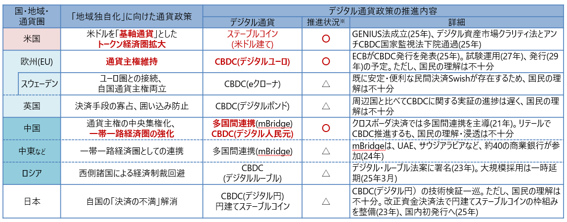 例えば、米国では、2025年6月にパウエルFRB議長が「ドルの基軸通貨地位は今後も揺るがない。(ドルの基軸通貨は)米国の金融政策の根幹にある」と発言するなど、米ドルの基軸通貨維持を通貨政策として強調している。また、ベッセント財務長官の「米国債に裏打ちされた(民間)ステーブルコインが誕生することで、基軸通貨ドルの優位性を維持できる」という米下院での発言からわかるよう、米政府は、デジタル・民間主導促進による米ドルの基軸通貨維持に向けた法規制整備を、通貨政策の一環として推進している。一方欧州は、欧州中央銀行(ECB)のラガルド総裁が「米ドル建てを代表する外国のステーブルコイン発行者に対し『セーフガード』と『強固な同等性制度』を要求すべき」と発言するなど、欧州の通貨主権維持のため、国家主導での通貨政策を推進している。さらに中国は、中国人民銀行元総裁の周小川氏が「米ドルに連動するステーブルコインが国際金融の米ドル化を加速させる可能性がある」と発言し、国有企業の海外進出において、人民元による決済を優先するよう促すなど、「一帯一路」沿線国への通貨圏拡大・国際化に向けた国家主導の通貨政策を推進している。