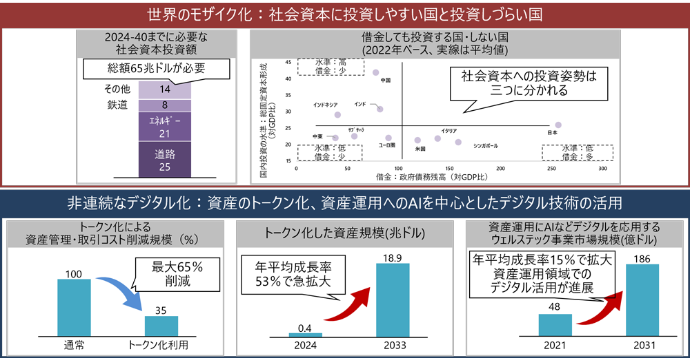 資料:BlackRock(2025年)「Larry Fink’s 2025 Annual Chairman’s Letter to Investors」、IMF Data、World Bank Open Data、Boston Consulting Group(2025年)「Approaching the Tokenization Tipping Point」、Appinventiv(2025)「The Impact of WealthTech in Finance」など各種資料より日立総研作成