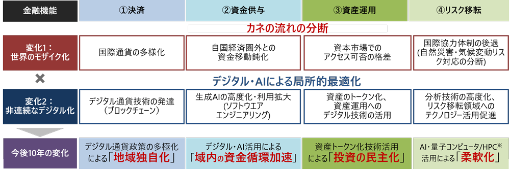 本章では、世界のモザイク化、非連続なデジタル化という二つの変化を軸に、10年後の金融4機能を展望する。