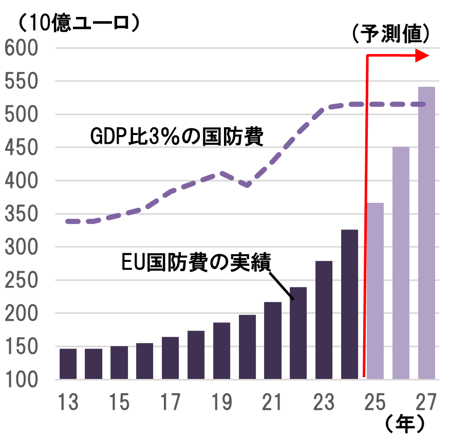 しかし、EUは米国など域外からの武器輸入が多く、2022年6月から2023年6月のEU加盟国の国防費約750億ユーロのうち、78%はEU域外から調達され、そのうち63%は米国からとされる。国防費増加のGDP押し上げ効果を示す財政乗数は0.5程度との推計が多く、この推計結果に基づけば、GDP押し上げ効果は900〜1,350億ユーロ程度、GDP比では0.6%前後となる。漸進的な国防費増額になると考えれば、2026〜27年を中心に、毎年0.3%ポイント前後のGDP成長率の押し上げになると予想される。
